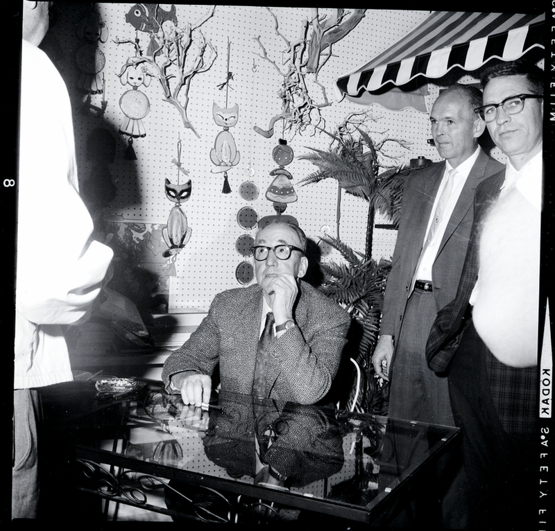 Vardis Fisher signs copies of his book "Mountain Man" at Sallie's Gifts & Books in Twin Falls. He is seated at a table, and three men stand around it. On the shelves behind him are copies of the book and various antiques and gift items.