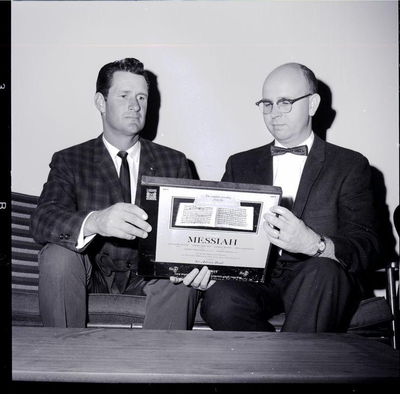 Examining music for Handel's "Messiah," to be presented at the Twin Falls Presbyterian Church, are Roger D. Vincent, director of the presentation, and Dr. Robert Harvey, chairman of the Magic Valley Council of Churches. The box reads "The complete recording from the original manuscript; Handel Messiah; Jennifer Vyvyan, Soprano; Norma Procter, Contralto; George Maran, Tenor; Owen Brannigan, Bass; George Malcolm, Harpsichord; Ralph Downs, Organ; The London Philharmonic Orchestra and the London Philharmonic Choir (Choir Master Frederick Jackson); Conductor Sir Adrian Boult." Roger Vincent is dressed in a plaid suit jacket and tie, and Dr. Robert Harvey is dressed in a suit and bow tie. A table sits in front of the couch.