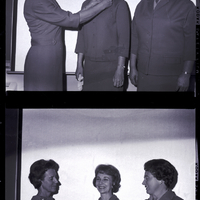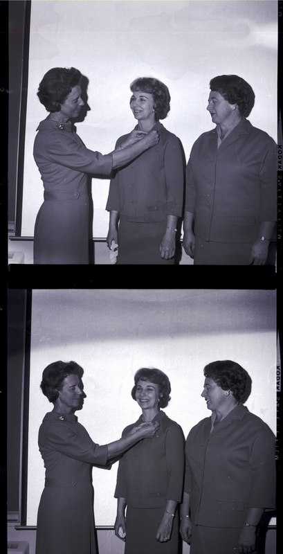 Mrs. D. A. Jackson, president of the Magic Valley Memorial Hospital Guild, pins the past president pin onto former Guild president Mrs. LeGrande Nelson, while president-elect Mrs. Frank Flint watches. Mrs. D. A. Jackson is wearing a dress, while the other two women are wearing jackets and skirts.