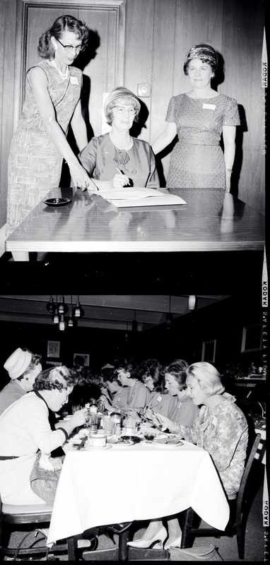 Purple Sage Cowbelles. They are wearing dresses and Mrs. Mink is wearing a hat. In the bottom image, guests enjoy lunch at the Cowbelles organizational meeting at the Depot Grill in Twin Falls. The table is filled with drinks and plates of food. Framed artwork hangs on the walls in the background.