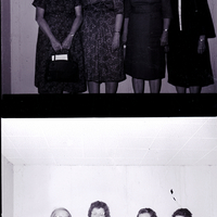 Four officers of the Magic Valley Iris Society stand in a hallway. From left to right are Mrs. C. W. Vallette, president; Mrs. Albert Toberer, vice president; Mrs. Glen Draper, corresponding secretary; and Mrs. Glenn Thietten, recording secretary. All the women are wearing dresses.