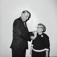 of School District 411, pins a corsage onto Idaho Teacher of the Year Ida Allen, who teaches first grade at Harrison Elementary School in Twin Falls. Mr. Ragland is dressed in a suit and tie and Ms. Allen is wearing a top and skirt. - Date
