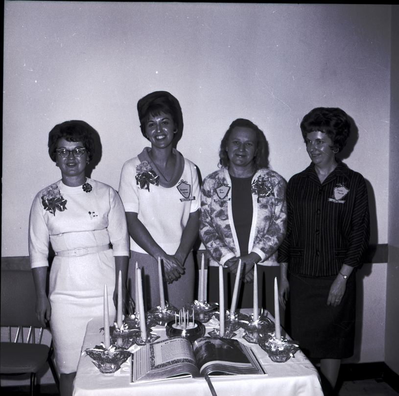 - Epsilon Sigma Alpha members stand behind a table covered in a white table cloth and displaying an open book and several candles. The women are wearing dresses, corsages, and name tags. Some chairs are against the wall behind them.
