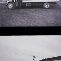 Harry Knigge, sanitation company foreman, and Chad Thompson, city sanitation inspector, stand in front of a new garbage truck owned by the Eldon Corporation. The side of the truck reads "The Elden Corp, Twin Falls, 733-5117." A building and a field with trees are in the background.