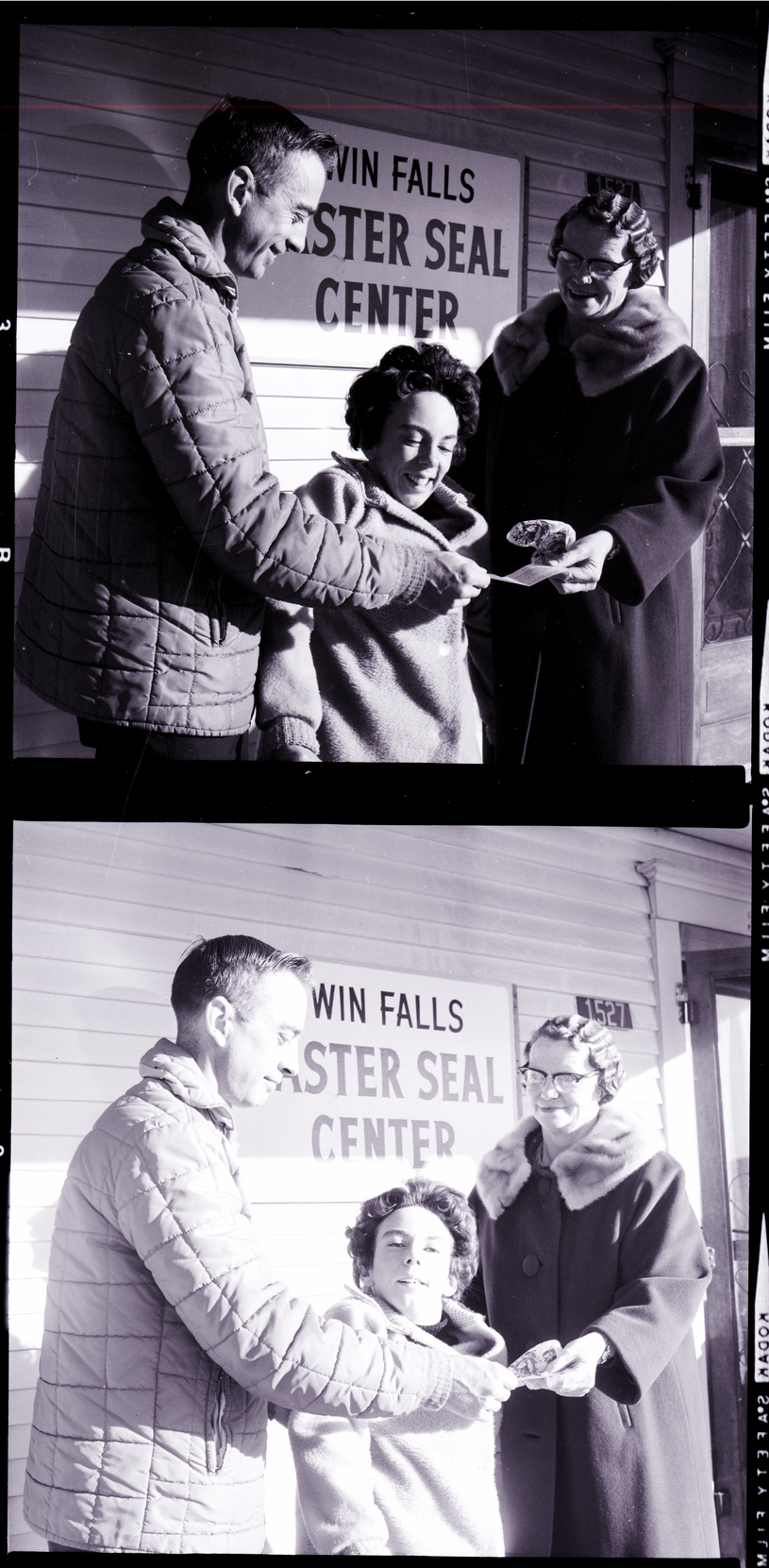 Robert Meuleman, Easter Seal Center bus driver, presents a check for $175 donated by the Union Pacific Old Timers Club to Mrs. E. P. Messner, Easter Seal Center worker, while Karleena Hills watches. Behind them the Twin Falls Easter Seal Center is visible. They are all dressed in thick winter coats.