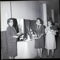 topiary tree display. Mrs. Nelson, sweepstakes winner for the most first prizes in artistic division, received the tricolor for best arrangement with fresh material predominating. Mrs. Hawkins won sweepstakes ribbons in the horticulture division. The three women are wearing dresses, and a table beside them has different floral displays and figurines on it.