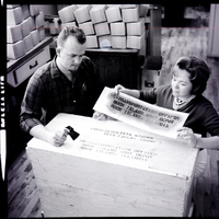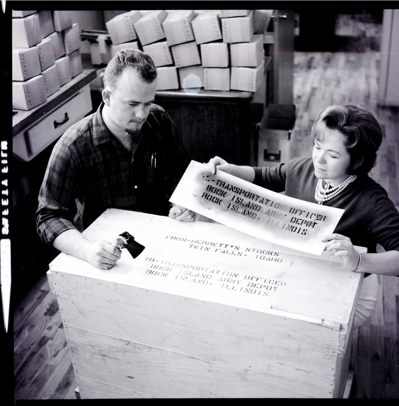 "From Herrett's Stock Twin Falls, Idaho, To Transportation Officer, Rock Island Army Depot, Rock Island, Illinois" is painted on a crate of precision-made wooden stocks manufactured by Steven J. Herrett. Holding the stencil is Marcia Hiatt, supervisor of inspection, and applying paint is Leonard Parkin. This is the last of a shipment of 10,000 flawless pairs of wooden pistol grips to be shipped to the U.S. Army Ordnance Department, for which Herrett is a prime contractor. The counter tops behind them are covered in boxes.