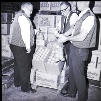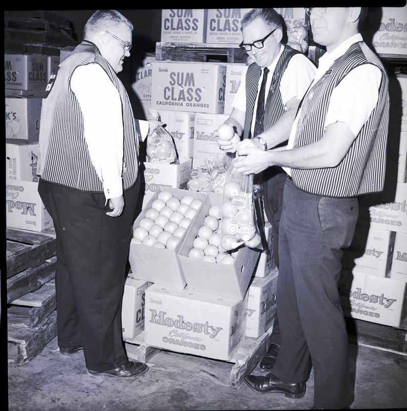 Sacking oranges for a sale being sponsored by the Magic Valley Jaycees to raise funds for needy children are, from left to right, Steven Porch, Darrell Sweet, and Alvin Wonenberg, members of the Twin Falls Jaycees. The three men are dressed in slacks, ties, and striped vests. Boxes of oranges are stacked up behind them.