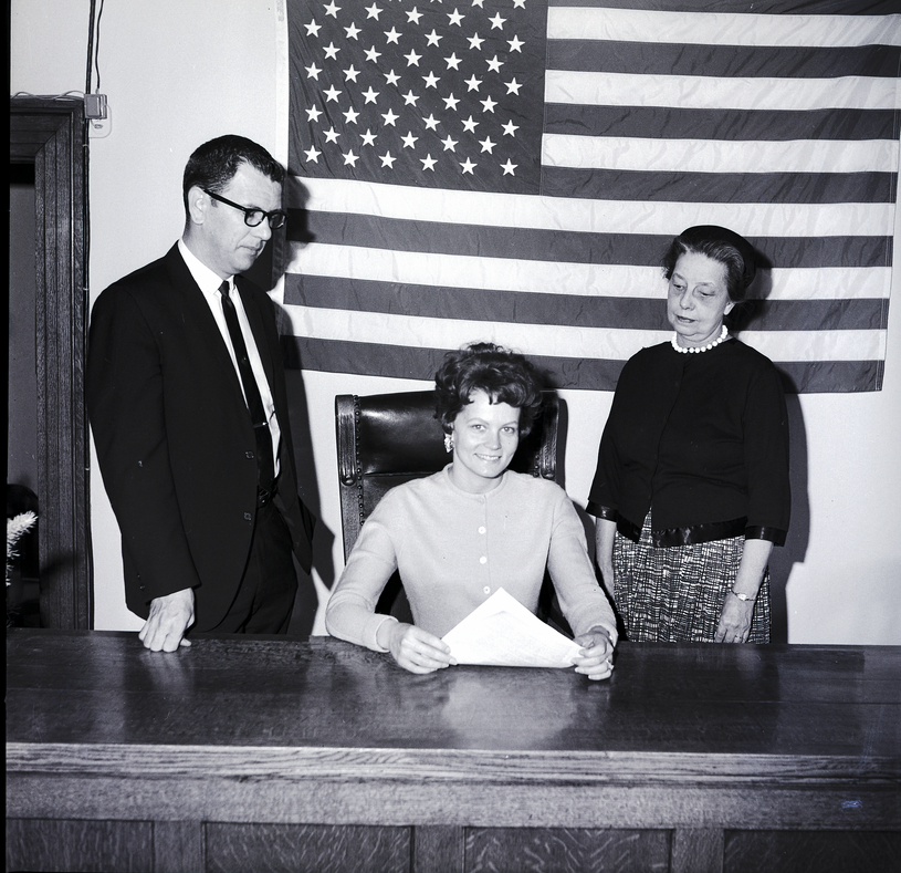 Reviewing proposed plans for an American Association of University Women's Trust Fund are, from left to right, Dr. Donald L. Keith, dean of the College of Southern Idaho, Judge Zoe Ann Shaub, and Mrs. Ernest Gyer, chairman of the fund committee. The trust fund, being established by the unit, will make loans available for local students who want to further their college education at the College of Southern Idaho. Dr. Keith is dressed in a suit and tie. Judge Shaub is wearing a dress and seated behind a large desk, holding a paper. Mrs. Gyer is wearing a blouse and patterned skirt. An American flag hangs on the wall behind them.