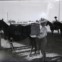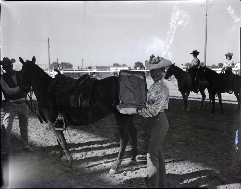 Alice Williams, Queen of the Magic Valley Western Horse Show displays a box with a shirt in it, one of many prizes at the horse show. She is dressed in a shiny jacket, pants, a decorative cowboy hat, and gloves. Dean Vickers leads a horse behind her, and on the horse is a saddle which was another prize at the horse show. In the background are two other horses with riders in cowboy hats.