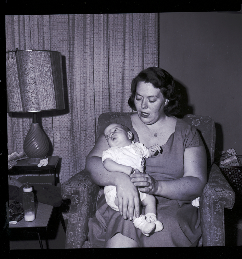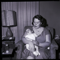 Mrs. James Lock sits in an armchair holding her infant son, Martin Timothy Lock. They were saved by a blood transfusion using donated blood to the American Red Cross. Mrs. Lock began hcmorrhaging while pregnant with Martin and required immediate surgery and three pints of an uncommon type of B positive blood during the operation. Only four pints of this type were on hand at the hospital and she and her baby would have died had it not been immediately available. Beside the chair is a stand with a lamp and a bottle on it. Behind the chair is a window covered in a long drape and a basket of newspapers in the corner.