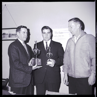 The high point aggregate scorer for the Twin Falls Police Department pistol competition, Cloyce Edwards, center, displays the trophies he won to O. J. Smith, left, and Police Chief Frank Barnett. Smith, city editor for the Times-News, presented the trophies on behalf of the Times-News, which sponsors the trophies each year. On the wall behind them is a poster of the Bill of Rights and a framed photograph.