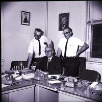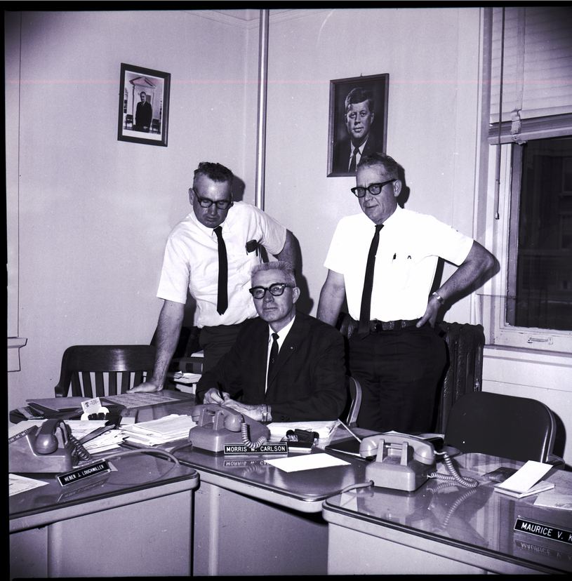 From left to right, city commissioners Heber Loughmiller, Maurice Klaas, and seated, Morris Carlson, sign a zoning ordinance. They are dressed in suits and ties. On the desks in front of them are several telephones, stacks of papers, and name signs reading "Heber J. Loughmiller," "Morris W. Carlson," and "Maurice V. Klaas." On the walls behind them are photos of President John F. Kennedy and Lyndon B. Johnson.
