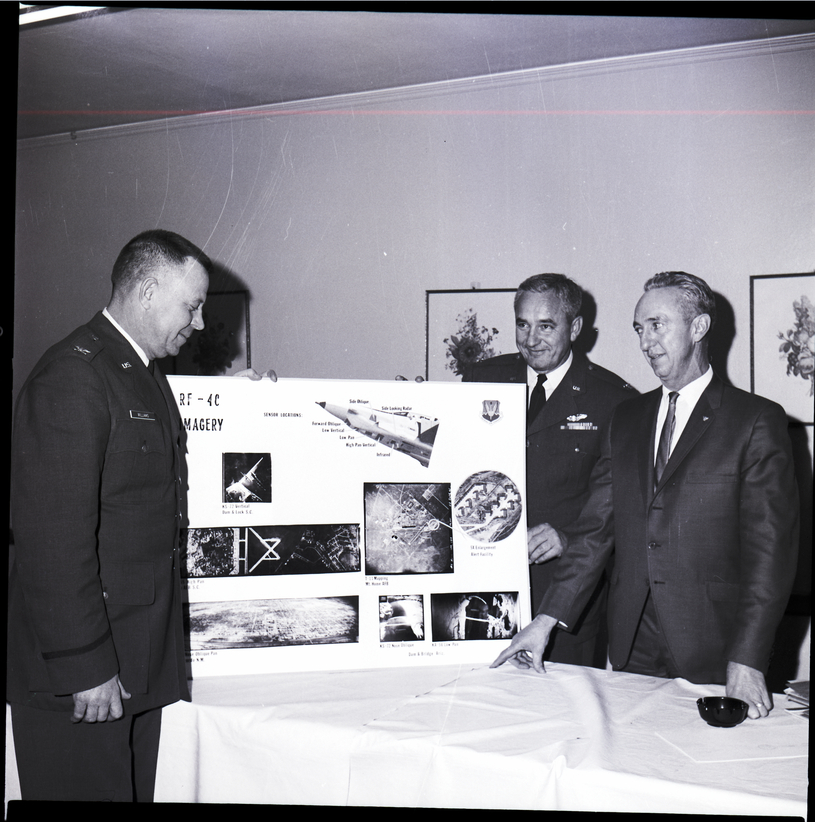 New Wing Commander at the Mountain Home Air Force Base, Col. Robert Williams, left, points out topics of his talk on RF-4C imagery to Col. Rudy Ashenbrener, commander of the 9430th Air Reserve Squadron, and Lt. Col. Harry LeMoyne, president of the Magic Valley Chapter of the Air Force Association, at an Air Force Association meeting held in Twin Falls. The poster shows the different locations of the sensors on the aircraft, and several photographs taken from the aircraft. Col. Williams and Col. Ashenbrener wear their military uniforms, and Lt. Col. LeMoyne is dressed in a suit and tie. Behind the men are framed illustrations of flowers hanging on the wall. The poster is sitting on a table covered in a white tablecloth and with an ashtray on it.