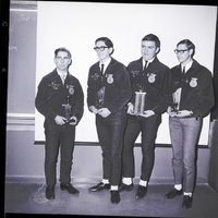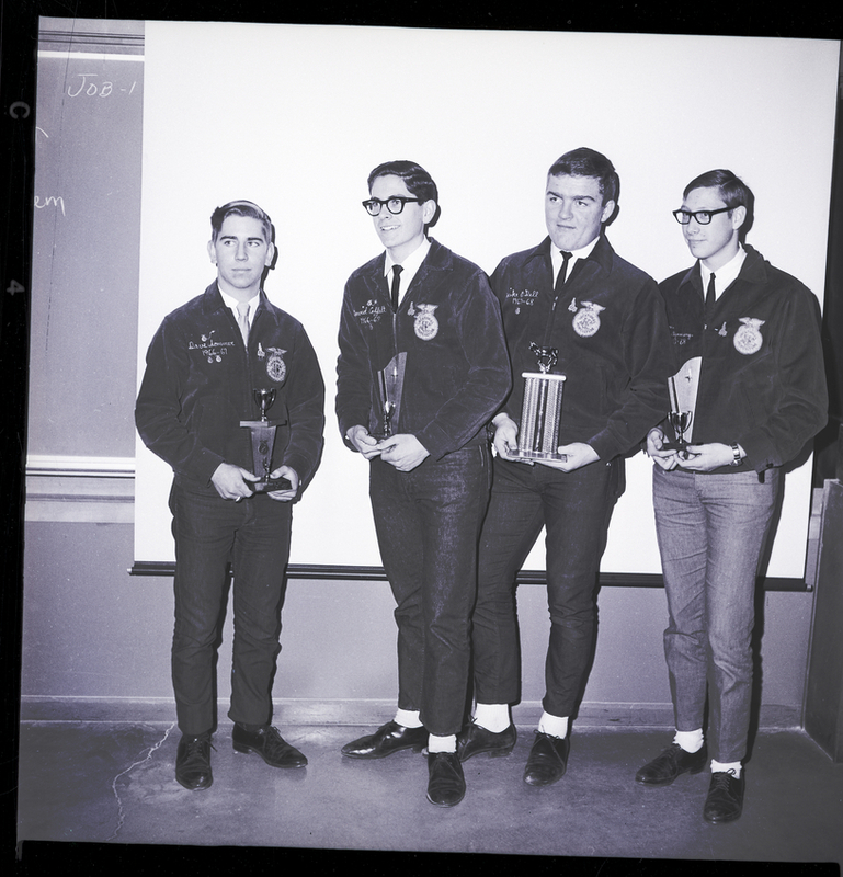 FFA contest winners at the west Magic Valley District FFA Contest held in Gooding display their award trophies. From left to right are Twin Falls FFA members David Sommer, David Coffelt, Michael O'Dell, and Donald Montgomery. They are dressed in suits and ties and their embroidered FFA jackets. In the classroom behind them is a projector drape and a blackboard.