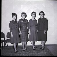 Officers meeting of the Extension Homemakers Councils and Extension Home Economics Agents was held in the Rogerson Hotel in Twin Falls. From left to right are Mrs. Ben Eldredge, president of the Twin Falls County Extension Homemakers Council, Mrs. H. V. Beaver, district director, Mildred Haberly, state home economics leader at Idaho State University, and Agnes Hurst, Twin Falls County extension home economics agent. They are all wearing dresses. Behind them are a few chairs.
