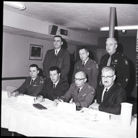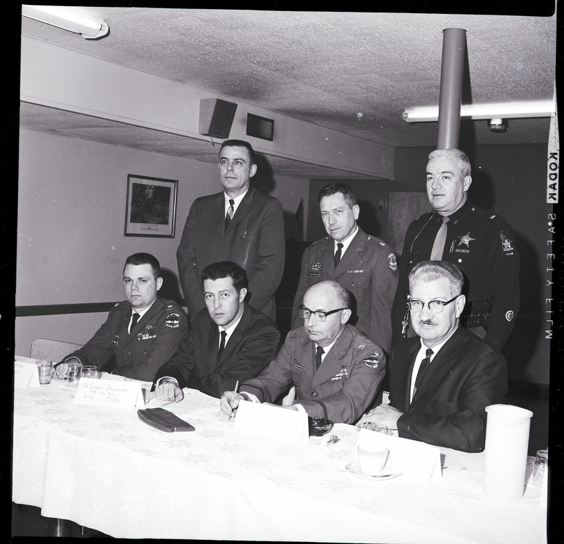 Civil Air Patrol board members sit at a table, looking over forms. Three of the men are wearing suits and ties, three are dressed in Civil Air Patrol uniforms, and one is dressed in a sheriff's uniform. Cups, ashtrays, papers, and name plates are on the table. One name plate reads "Mr. George Staudaher, Principal, High School." Pictures hang on the wall to the side of the room.
