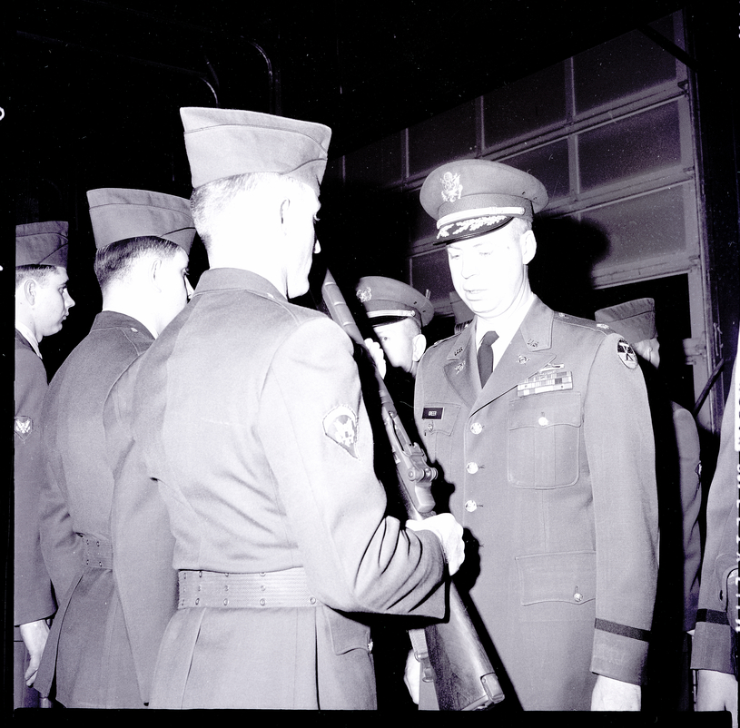 Conducting inspection of the local unit of the U. S. Army Reserve is Maj. Glenn E. Greer, representative of the Inspector General's office, X Corps headquarters at Ft. Lawton, Washington. The men are dressed in their military uniforms and standing at attention. The man in the foreground is holding a gun as the Inspector General looks him over.
