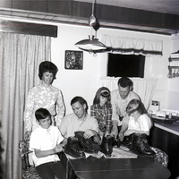 Mr. and Mrs. Larrey Anderson and their four children, Larry Anderson, Mark Hiedeman, Cherie Anderson, and Mary Ann Anderson, are seated around a dining table polishing shoes on top of some old newspapers. A picture of a house with a water mill hangs on the wall behind them. To the side is a long kitchen counter, and on the wall above it is a spice rack and some hanging measuring cups. Mrs. Larrey Anderson will represent the Magic Valley in the Mrs. Idaho competition to be held in Pocatello. The local contest was sponsored by KLIX Radio Station and Gold Strike Stamps.