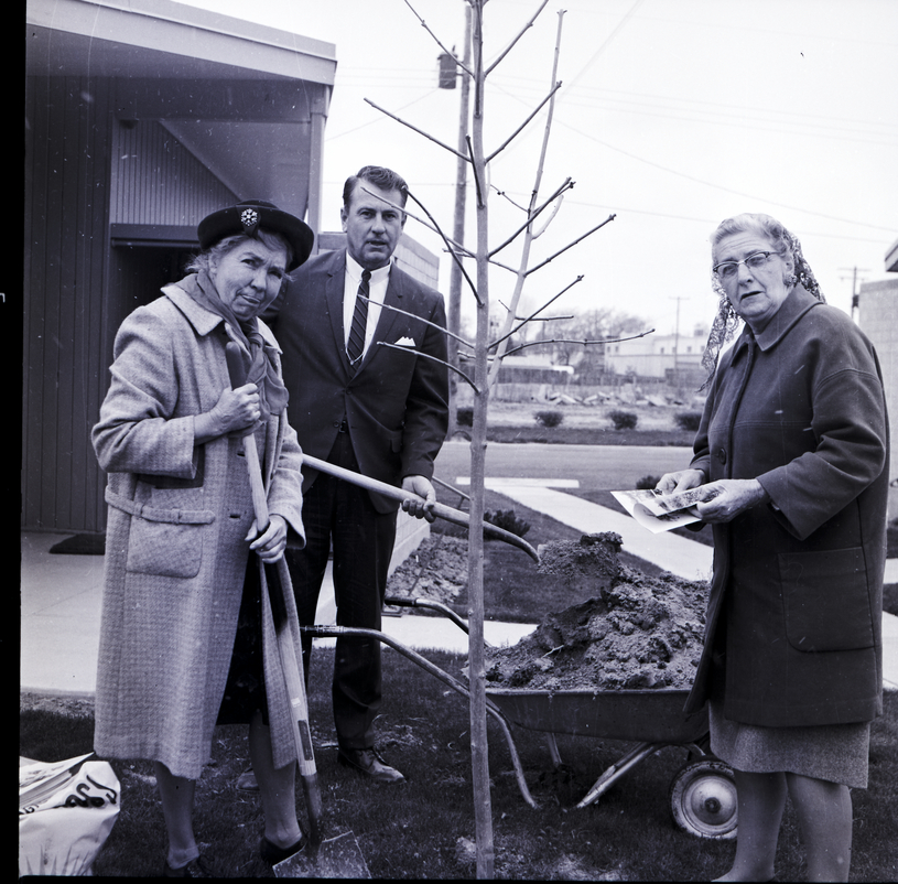 The Twin Falls Garden Club has won the Richfield Civic Beautification Award for its landscaping at Sunny View Courts. From left to right are Mrs. Sidney Smith, club president; Eugene Hendrickson, Richfield retail representative; and Mrs. T. W. Hicks, civic beautification chairman, plant trees amid a howling snow and wind storm. The women are wearing dresses and long coats, and Mrs. Smith is wearing a hat. Mr. Hendrickson is wearing a suit and tie. A tree is between them, and they are filling in the hole around it from a wheelbarrow of dirt using long shovels. Some buildings and a yard are visible in the background.