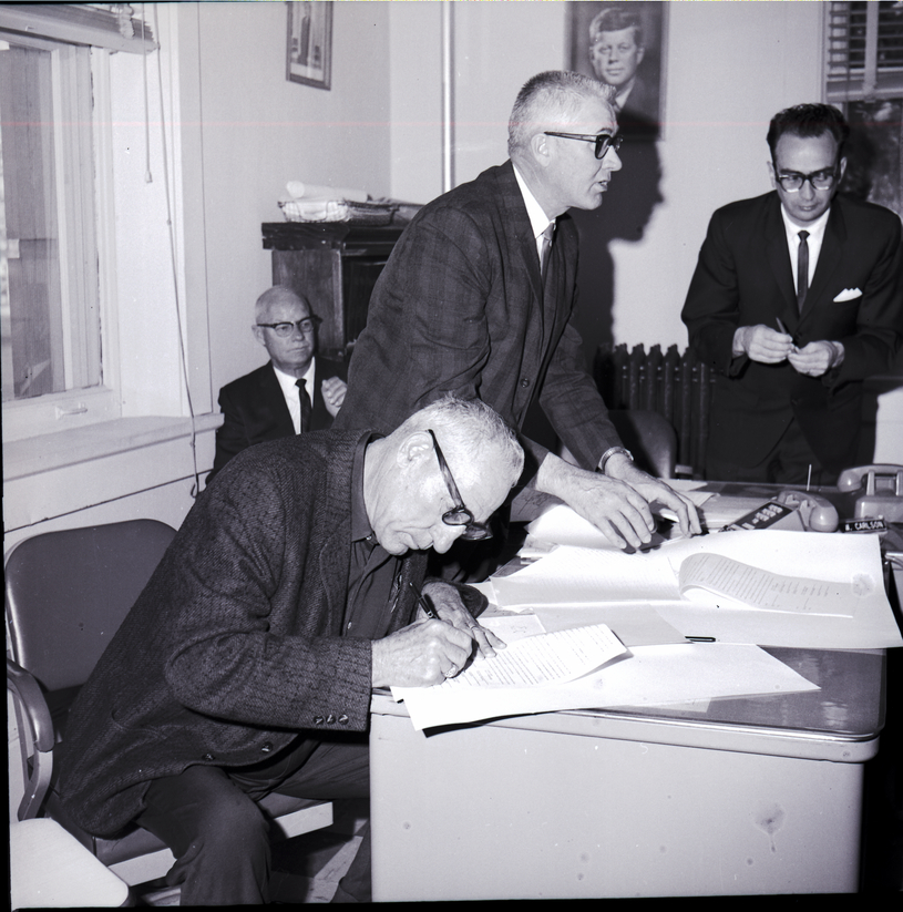 Representatives from Twin Falls County, Gooding County, Westpoint Highway District, and the Buhl Highway District gather in an office for the signing of the proposed agreement of the Clear Lakes Bridge. Two of the men are behind a desk covered in papers, and the man in the foreground is seated and signing a form. Two telephones are also on top of the desk. The two other men are in the back of the office. A picture of President John F. Kennedy hangs from the back wall.