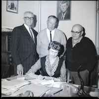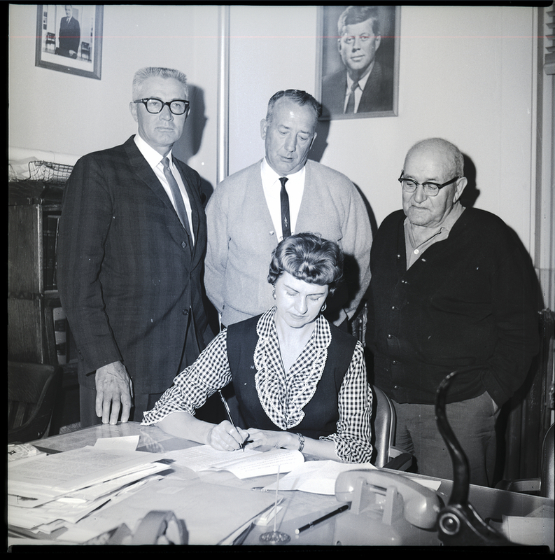 Representatives from Twin Falls County, Gooding County, Westpoint Highway District, and the Buhl Highway District gather in an office for the signing of the proposed agreement of the Clear Lakes Bridge. The woman is seated behind a desk covered in papers, signing a form. Two telephones and a hole puncher are also on the desk. Standing behind her are three men. Behind them is a file cabinet, and hanging from the back walls are pictures of Presidents John F. Kennedy and Lyndon B. Johnson.