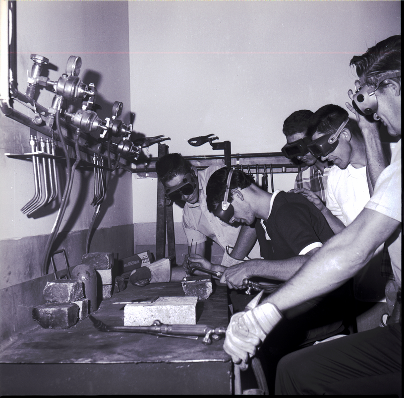 A group of men wearing welding glasses work in a new welding area made possible by the enlargement of the College of Southern Idaho's vocational school. Dwight Bair welds a piece of metal onto a brick. Lyle Canoy sits to his left, watching. Bricks and tools cover the work table. Several tools hang on the wall above the table.