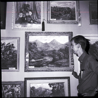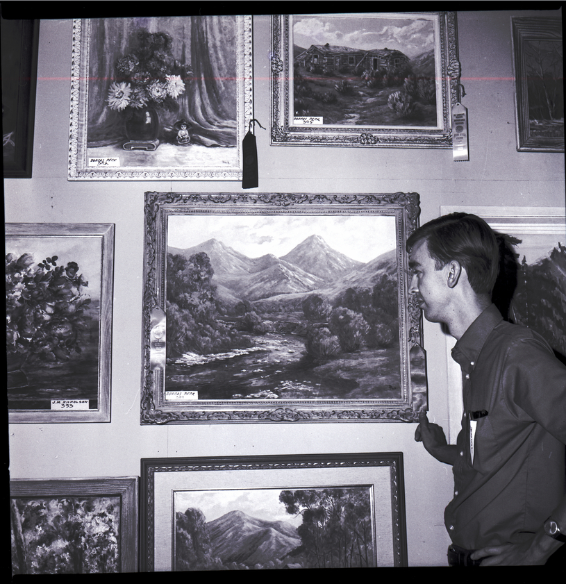 Warren Gossett admires "Spring in Wood River," a landscape oil painting by Dorcus Peck of a river stream running through the mountains, that won the Best of Show award at the Twin Falls County Fair. Other paintings on display by Dorcus Peck that won award ribbons include a still life of flowers and a house on a prairie. A painting of some flowers by J. M. Nicholson is hanging to the side.