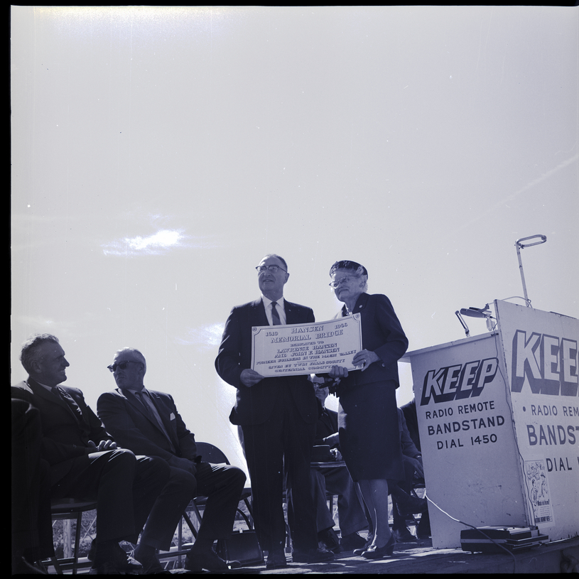 Dan Cavanagh, pioneer builder and contractor for the Hansen suspension bridge, holds up a sign that reads "1919 - 1966 Hansen Memorial Bridge, Dedicated to Lawrence Hansen and John F. Hansen, Pioneer Builders in the Magic Valley. Given by Twin Falls County Centennial Committee" at the Hansen Bridge dedication. Anna Hansen Hayes stands beside him, dressed in a jacket, skirt, and hat. In front of them is a podium that reads "KEEP Radio Remote Bandstand Dial 1450." Several men wearing suits and ties sit in folding chairs on the stage behind them.