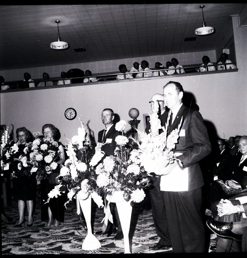 A group of men and women stand behind large stands of flowers or hold bouquets in their hands during the Reception of the Flowers at the 99th annual Communication of the Grand Lodge of Idaho, held at the Twin Falls Masonic Temple. The men, from left to right, are Jack Waegelin, Twin Falls Shrine Club; Floyd Bandy, Twin Falls Chapter of the Royal