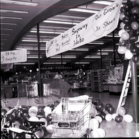 Dick Anderson, merchandiser, stands on a ladder hanging a string of balloons from a banner at the Safeway grand opening. The banner reads "Welcome to the 'Most' Modern, Beautiful Safeway in Idaho, Our Grown is Shown." In the foreground are piles of balloons and a shopping cart. Isles of groceries and cashiers are in the background. A sign over the checkout counters reads "All Day Every Day."