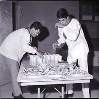 From left to right, Fernando Escalante and Jorge Salgado arrange cups of punch and plates of candy on a refreshment table at a Mexican posada held at the YM-YWCA building for host families of eleven Mexican youths visiting Twin Falls as part of the Experiment in International Living program. The boys are dressed in dressed in white shirts with bandannas around their necks. On the table are some small wicker baskets holding candles as decorations.