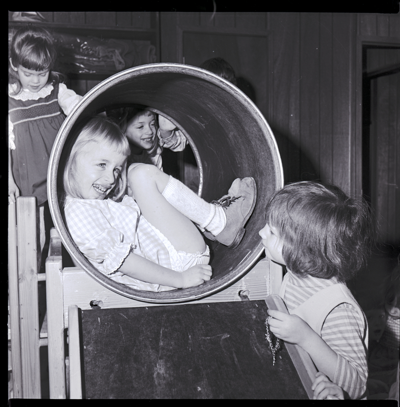 - Several children, including one of the Hill twins, play on a tunnel at Children's Village, a Montessorian method pre-school in Twin Falls run by Mrs. Charles Hopkins.