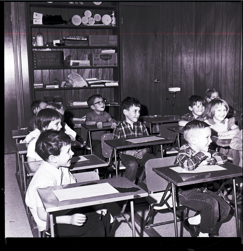 Several children sit at desks in a classroom at Children's Village, a Montessorian method pre-school in Twin Falls run by Mrs. Charles Hopkins. The kindergarten-aged children have graduated from nursery tables and chairs into the scaled-down desks. Each desk has a long paper on top of it. In the back of the room is a bookcase that is filled with boxes and various supplies. A door and a water fountain are in the corner of the room.