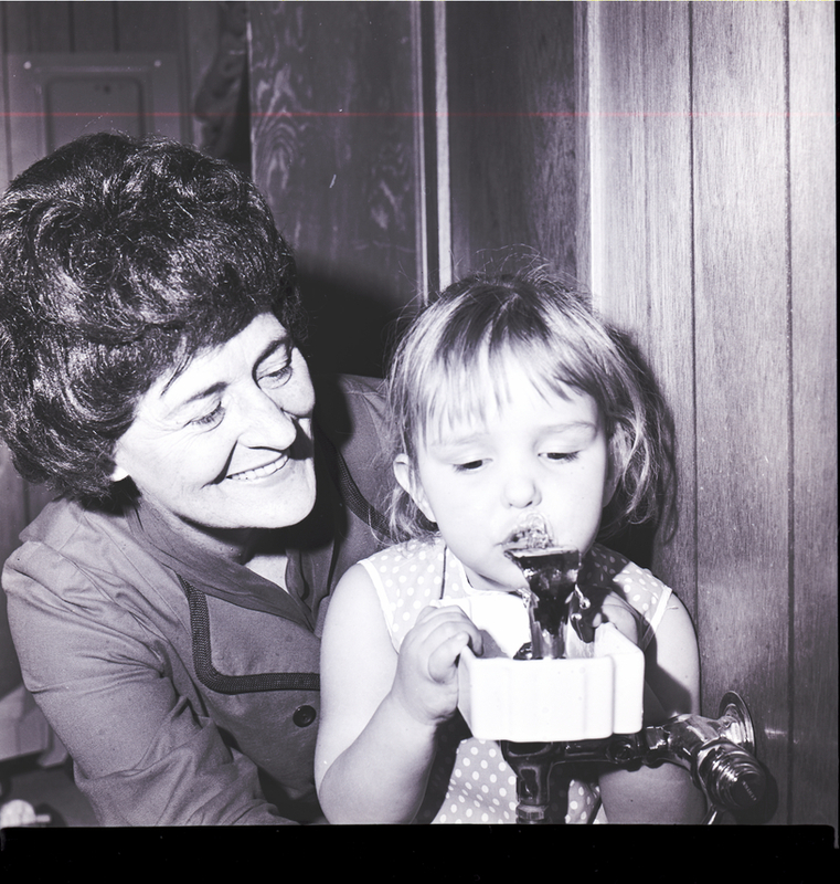 Mrs. Charles Hopkins helps a little girl get a drink from the water fountain at Children's Village, a Montessorian method pre-school in Twin Falls. Mrs. Hopkins runs the Montessorian-type school, which emphasizes learning through free physical activity and informal and individual instruction.