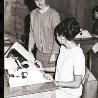 Dr. Adele Thompson gives pointers to Teri Murray, a CSI student in her evening typing class. Teri Murray is seated at a desk with a typewriter on it, and glances over at a typing book propped up on a stand. Other students are working on typewriters around the classroom.