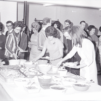 A large group of people stand in line for a potluck dinner at the Country Music Jamboree appreciation dinner held at the Twin Falls Moose Hall. On the table are an assortment of bowls of salads, a pan of meat, and a tray of dinner rolls. In the background behind the line of hungry people is a coat wrack and a picture of the American flag hanging on the back wall.