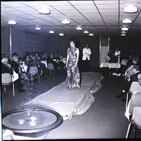 A woman models a patterned sleeveless dress at a fashion show during the Filer Kiwanis Club Ladies' Night held at the Twin Falls Holiday Inn. She walks down a runway with a fountain at the end. Several people sit in chairs at the side of the room, watching. At the back of the room is a table covered in a white tablecloth with a bouquet of flowers on top, and Mrs. Morris Carlson, the narrator of the event, stands behind it.
