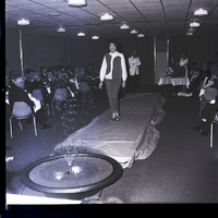 Mrs. Robert Blastock Jr. models a turtleneck and pants at a fashion show during the Filer Kiwanis Club Ladies' Night held at the Twin Falls Holiday Inn. She walks down a runway with a fountain at the end. Several people sit in chairs at the side of the room, watching. At the back of the room is a table covered in a white tablecloth with a bouquet of flowers on top, and Mrs. Morris Carlson, the narrator of the event, stands behind it.