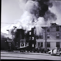 Tongues of flame lick through windows and smoke billows up from the Lincoln Inn in Gooding. The Cellar Bar Club and Gooding County Court House offices in the building were also destroyed in the fire. A truck is parked on the side of the street outside the building, and long hoses trail over the street.
