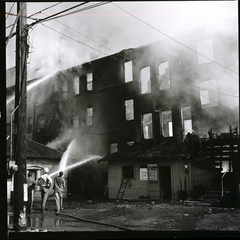Tongues of flame lick through windows and smoke billows up from the Lincoln Inn in Gooding as fire fighters pour streams of water onto the building, to keep the fire from spreading. The Cellar Bar Club and Gooding County Court House offices in the building were also destroyed in the fire.