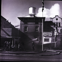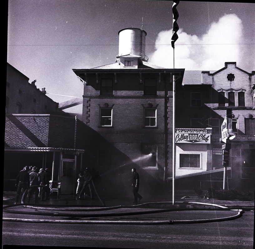 Tongues of flame lick through windows and smoke billows up from the Lincoln Inn in Gooding as fire fighters pour streams of water onto the building, to keep the fire from spreading. The Cellar Bar Club and Gooding County Court House offices in the building were also destroyed in the fire. Long hoses trail along the street.