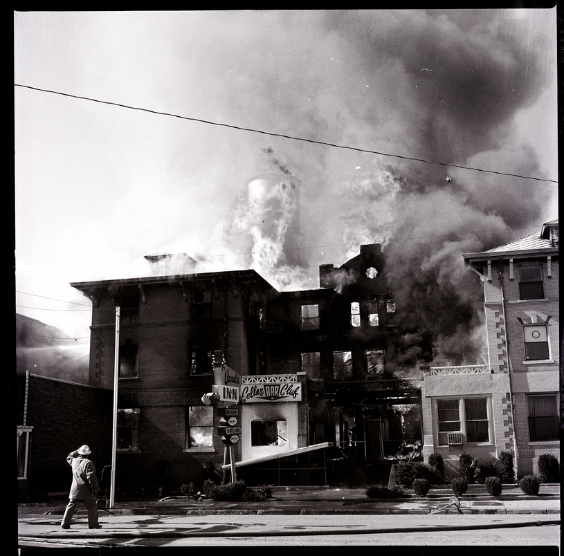 Tongues of flame lick through windows and smoke billows up from the Lincoln Inn in Gooding. The Cellar Bar Club and Gooding County Court House offices in the building were also destroyed in the fire. Long hoses trail along the street, and a firefighter stands on the sidelines, watching the fire.