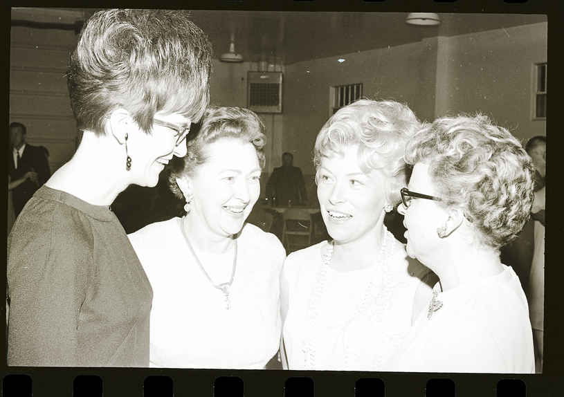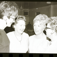 Discussing expansion possibilities for the Buhl Public Library with the Buhl librarian, Mrs. Al Karaloff, second from left, are, from left, Mrs. Ted Diehl, Mrs. Derek Cantrell, and Mrs. John Miracle. Mrs. Miracle was general chairman of the recent "Light the Way" benefit held at the Buhl National Guard Armory, sponsored by the Exemplar Chapter, Beta Sigma Phi. Other attendees of the fundraising party dine and dance in the background.