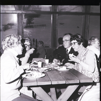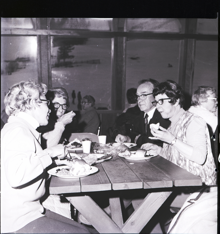 Three women and a man sit at a table and eat dinner at a party held at Soldier Mountain Ski Resort. Seated on the right of the table are Dr. and Mrs. Marion J. Kerns. Other attendees are seated at tables around the lodge eating and visiting. Through the large lodge windows, the snowy mountain is seen outside.