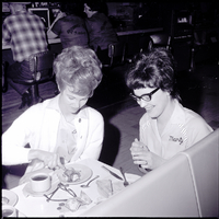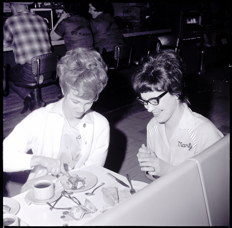 Two women enjoy some pie and coffee at the Magic Bowl during the 25th Idaho State Woman's Bowling Association Tournament. On the table are some plates, silverware, a pair of glasses, and a dollar bill and change. One woman is dressed in a blouse and sweater, and the other is wearing an embroidered shirt reading "Marty." In the background behind them three people sit at a bar.