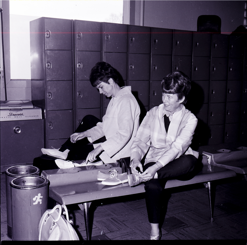 Two women sit on some benches changing into their bowling shoes at the Magic Bowl in Twin Falls, where the 25th Idaho State Woman's Bowling Association Tournament was held. Behind them is a wall of lockers. On the ground beside the bench is a bowling ball bag.