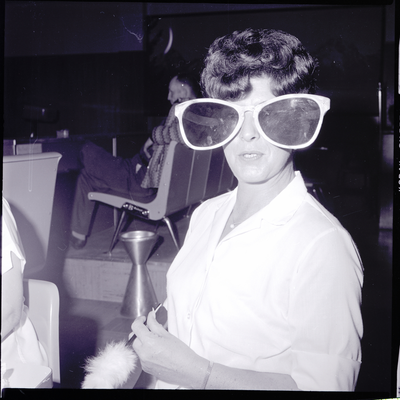 A woman stands in the Magic Bowl in Twin Falls wearing a pair of over-sized glasses and holding a pen with a feathered end, attending the 25th Idaho State Woman's Bowling Association Tournament. Behind her a man sits in a seat watching the bowlers.