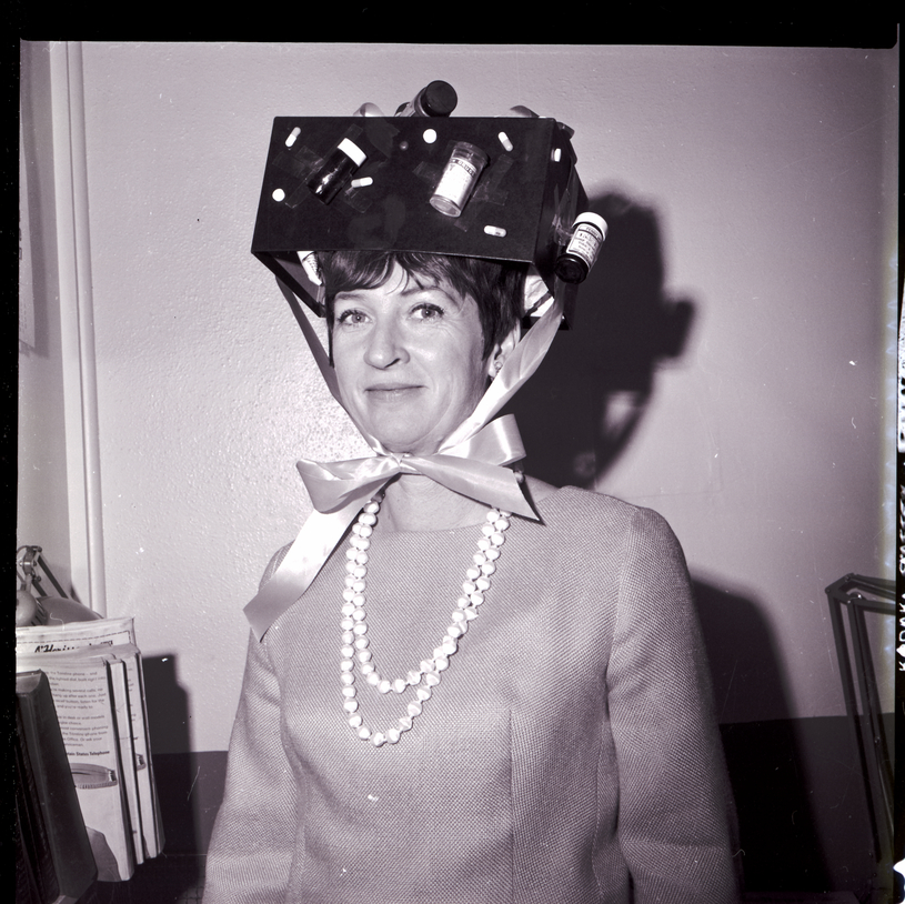 A woman wears a hat that is a square box covered in pills and pill bottles and tied under her neck with a ribbon. The hat is homemade for Easter and worn during the Ladies of the Elks hat parade.