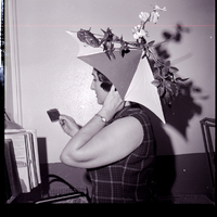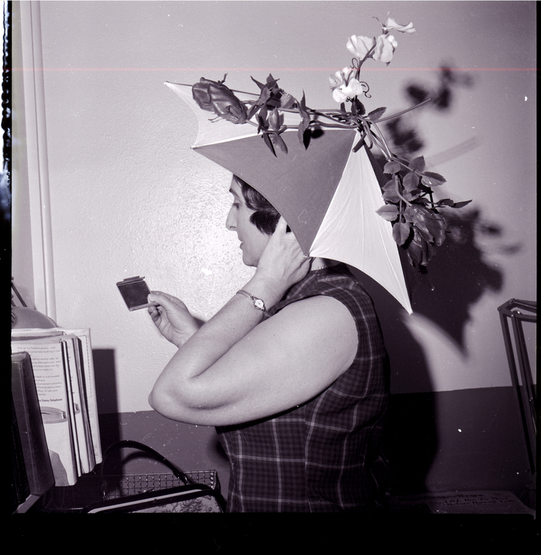 Ola Cannon wears a hat shaped like an umbrella and decorated in plastic flowers. The hat was homemade for Easter and worn during the Ladies of the Elks hat parade.